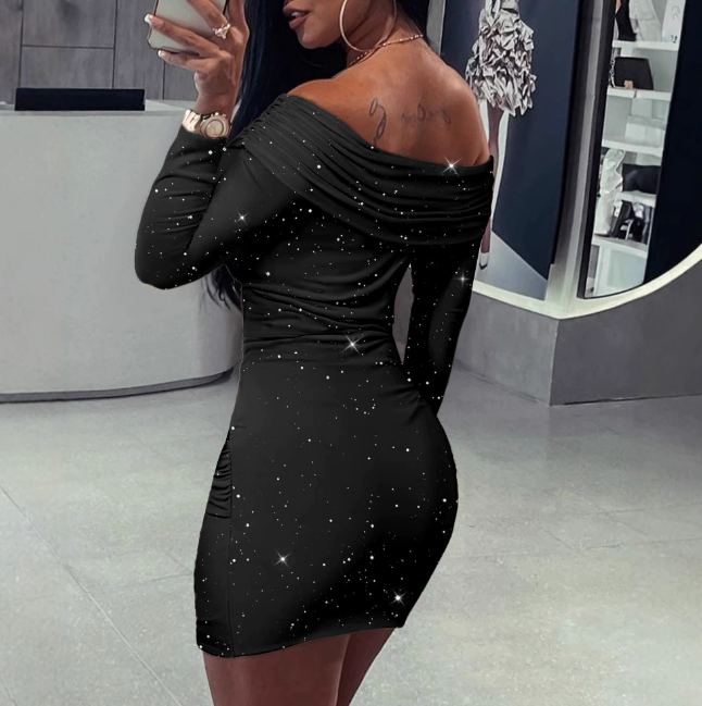 Elastic Force One Shoulder Tight Fitting Long Sleeves Wrap The Buttocks Dress