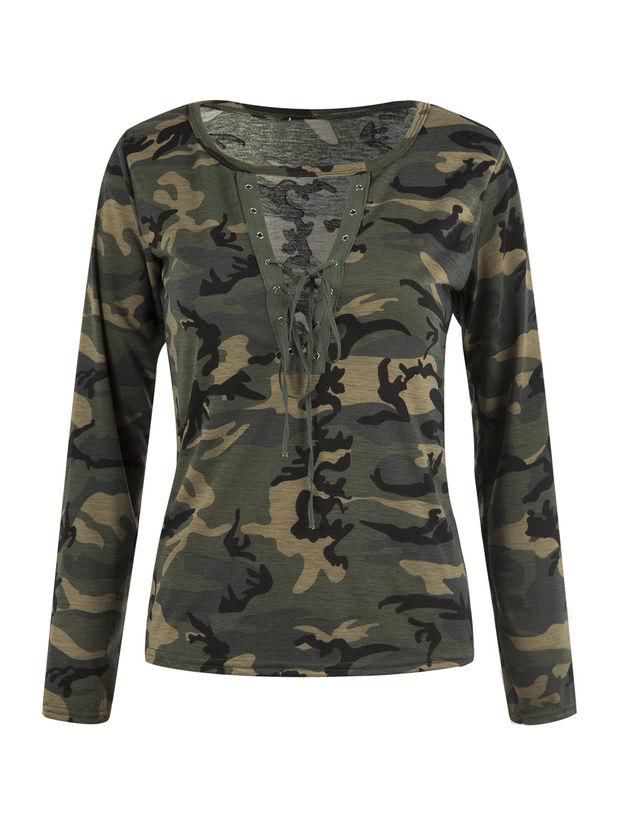 Green Camo Plunge Lace-up Front Long Sleeve T-shirt