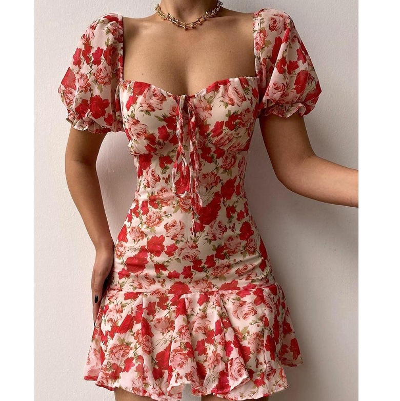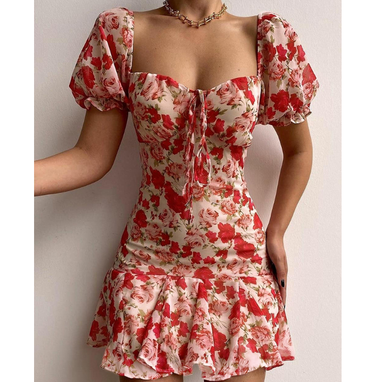 Short Sleeve Red Print Dress
