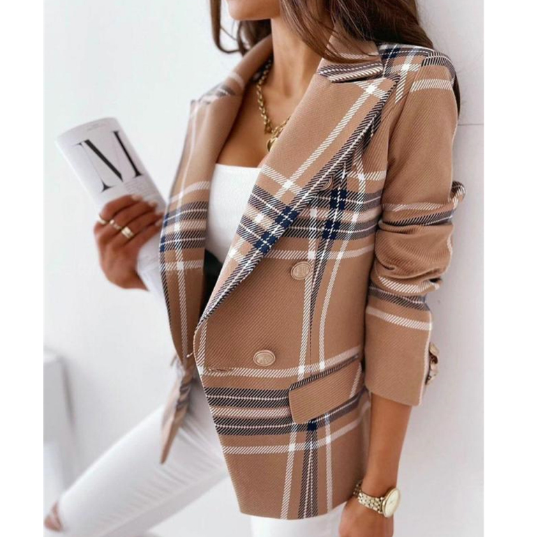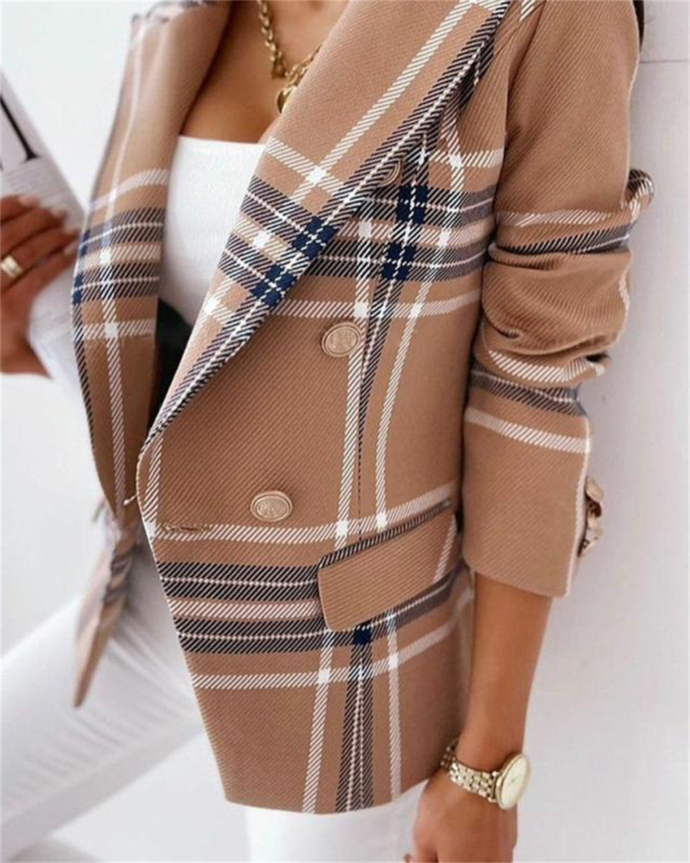 Fashion Long-Sleeved Double-Breasted Plaid Print Coat