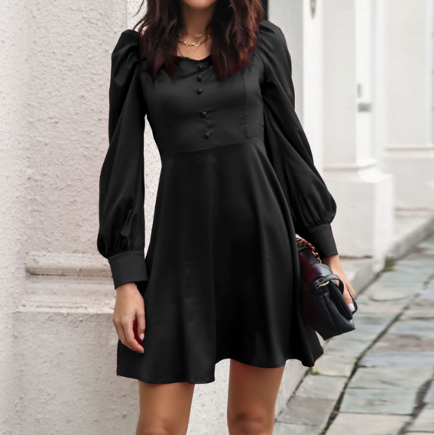 Elegant Solid Color Puff Sleeve Long Sleeve High Waist Dress
