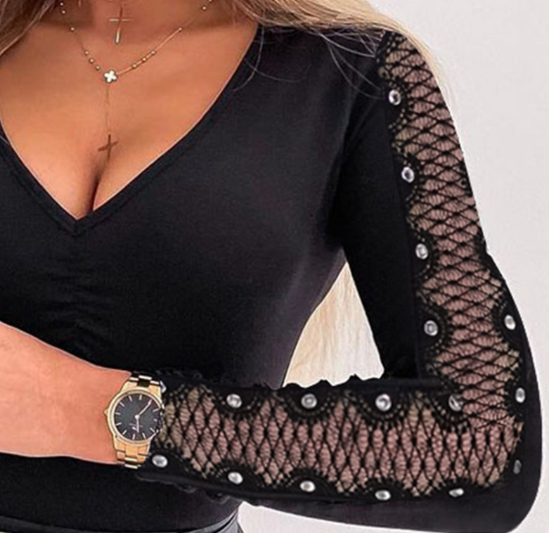 V-Neck Women'S Long Sleeve Splicing Black Top